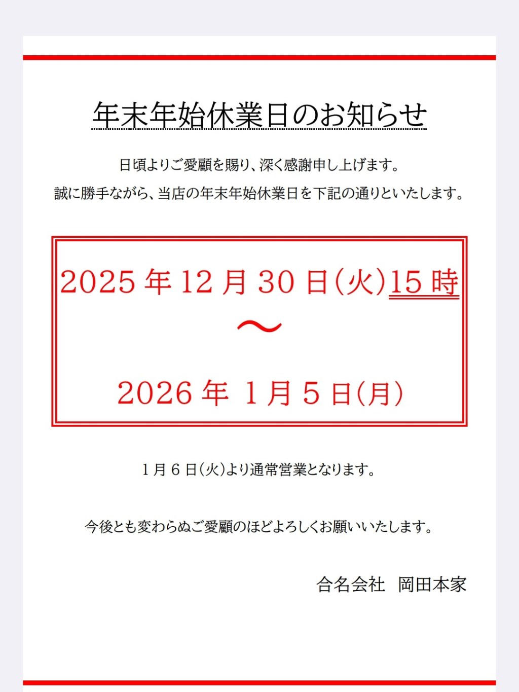 年末年始 休業日のお知らせ